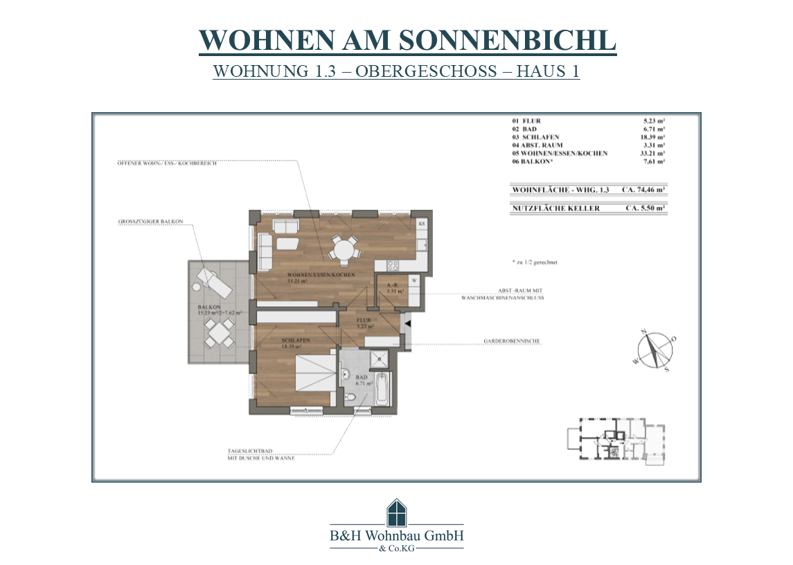 | WOHNUNG 1.3 | OG | 2 ZKB - ABST.-RAUM | 74,46 m² | RESERVIERT | 446.760,00€ | |
