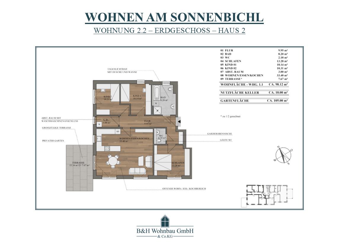 | WOHNUNG 2.2 | EG | 4 ZKB - ABST.-RAUM - WC | 98,12 m² | ca. 105,00 m² | VERKAUFT | 583.814,00€ |