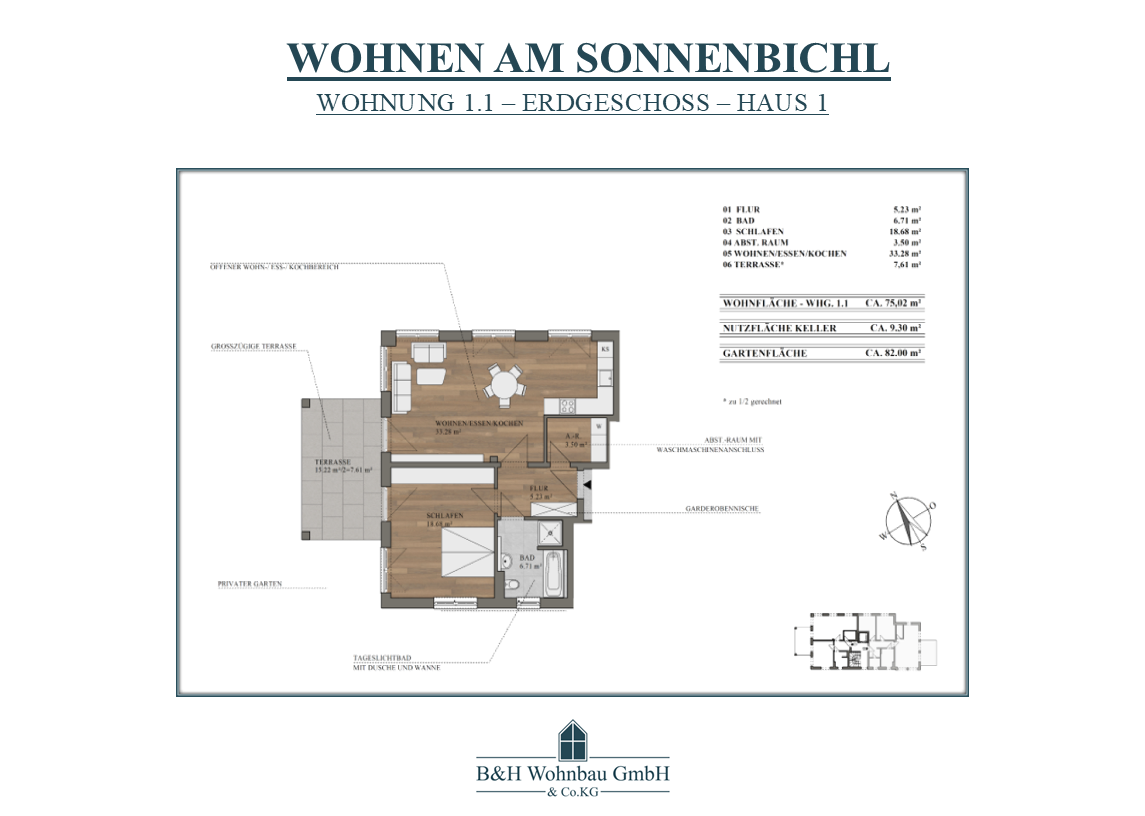 | WOHNUNG 1.1 | EG | 2 ZKB - ABST.-RAUM | 75,02 m² | ca. 82,00 m² | RESERVIERT | 446.369,00€ |