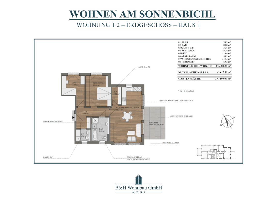 | WOHNUNG 1.2 | EG | 3 ZKB - ABST.-RAUM + WC | 88,27 m² | ca. 190,00 m² | VERKAUFT | 525.206,50 € |