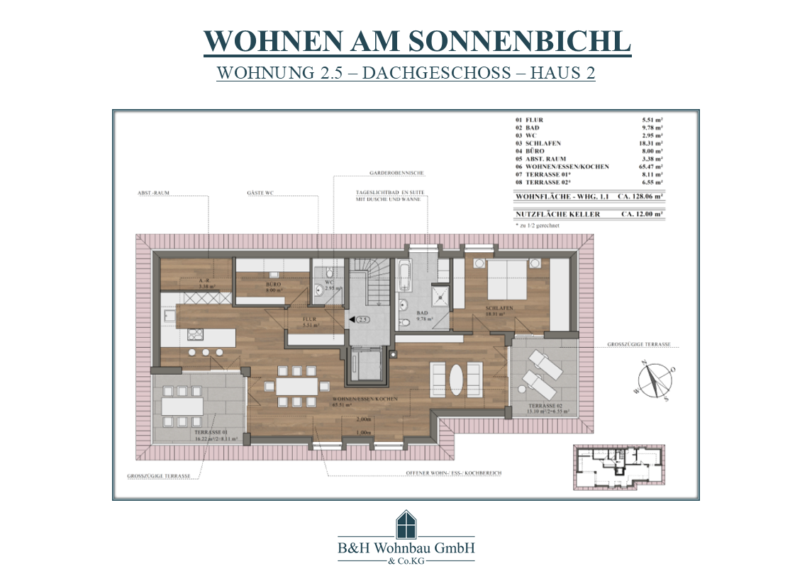 | WOHNUNG 2.5 | DG | 3 ZKB - ABST.-RAUM - WC | 128,06 m² | VERKAUFT | 800.375,00€ |
